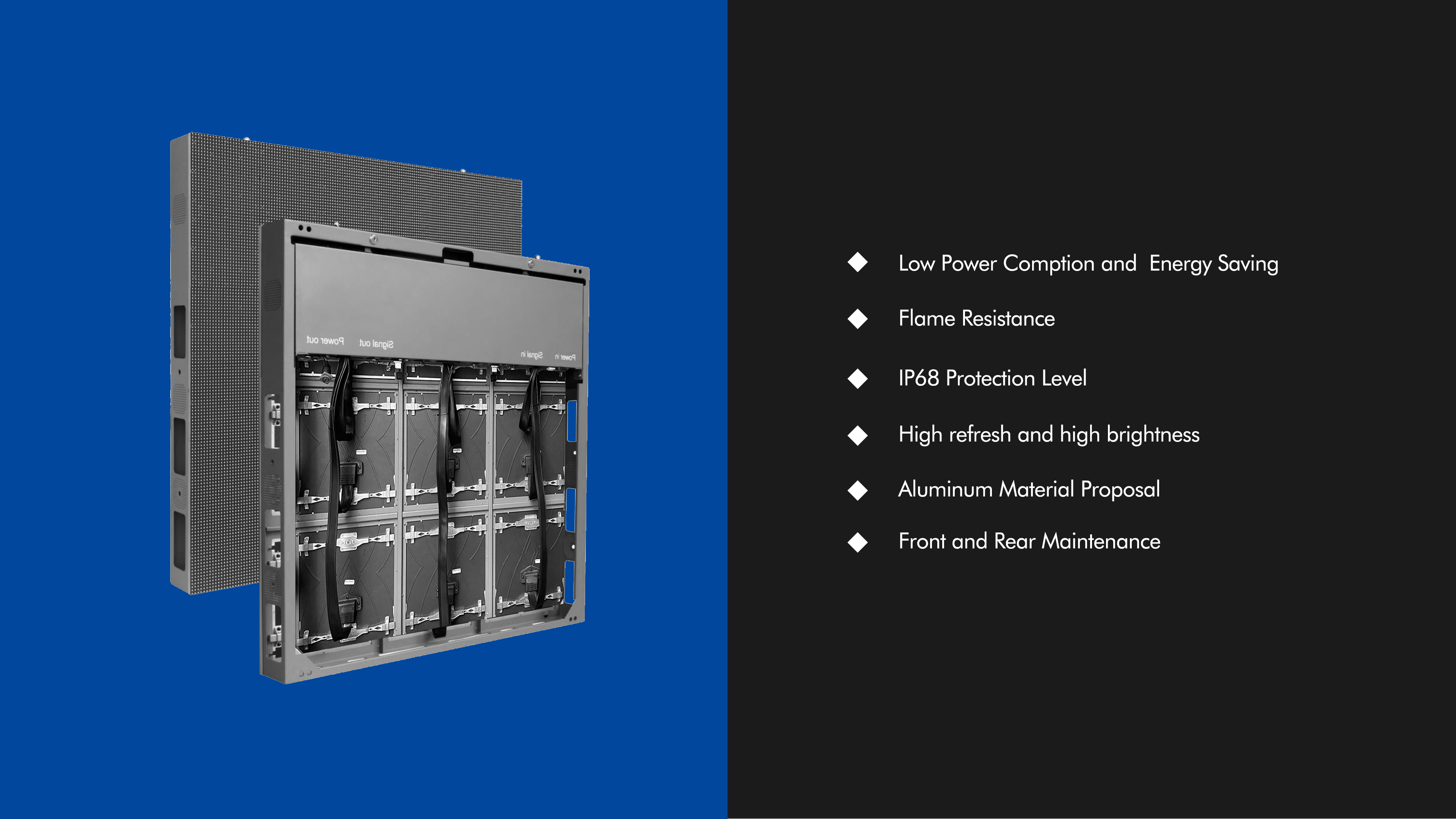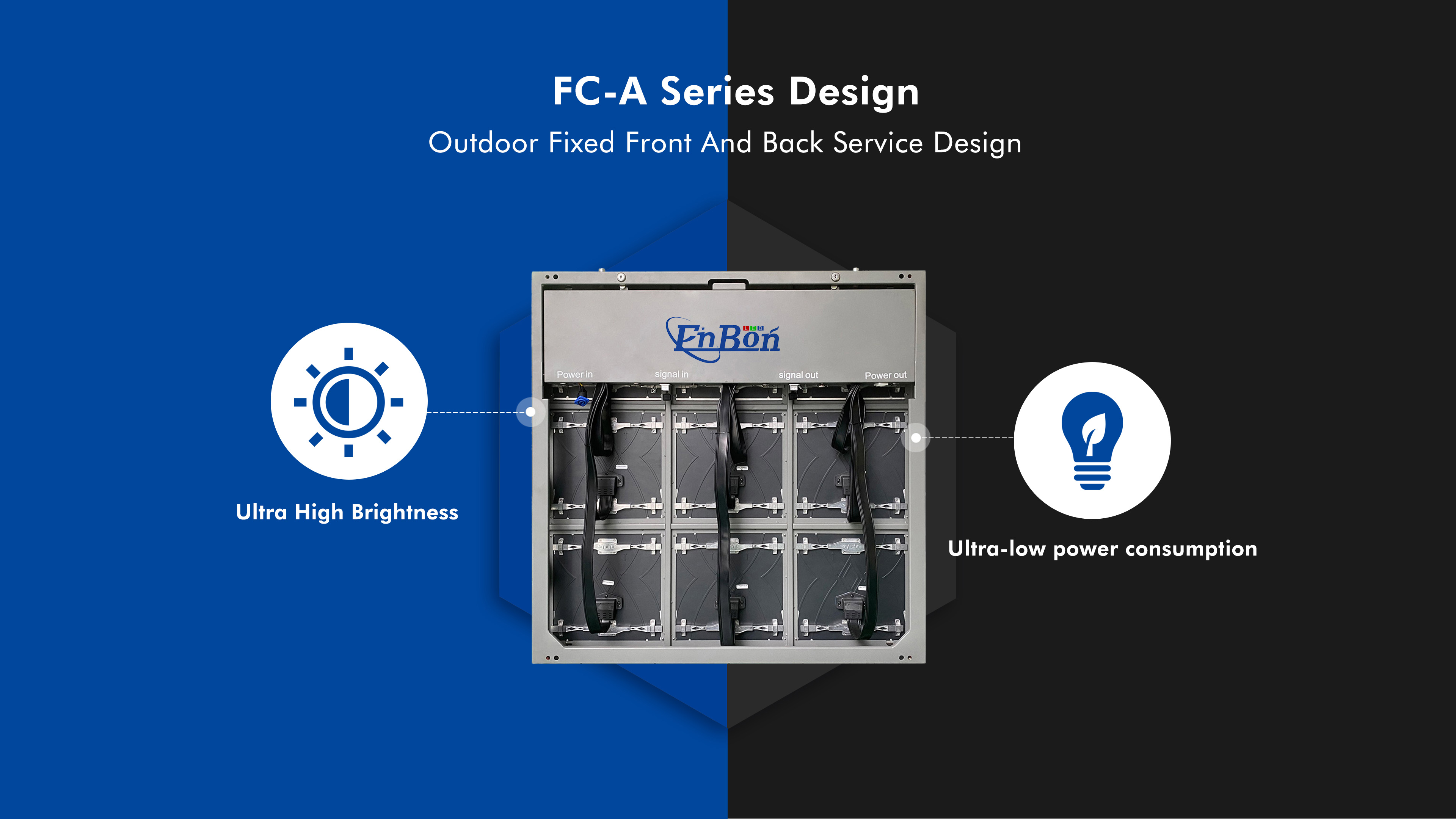 Instalação fixa externa Enbon FC-A, gabinete e módulos de alumínio, economia de energia de cátodo comum, serviço frontal e traseiro, design totalmente destacado e de alta atualização, pode ser usado para grande parede de vídeo de design 3D. O nível impermeável de alto nível atende ao projeto externo de alto nível.