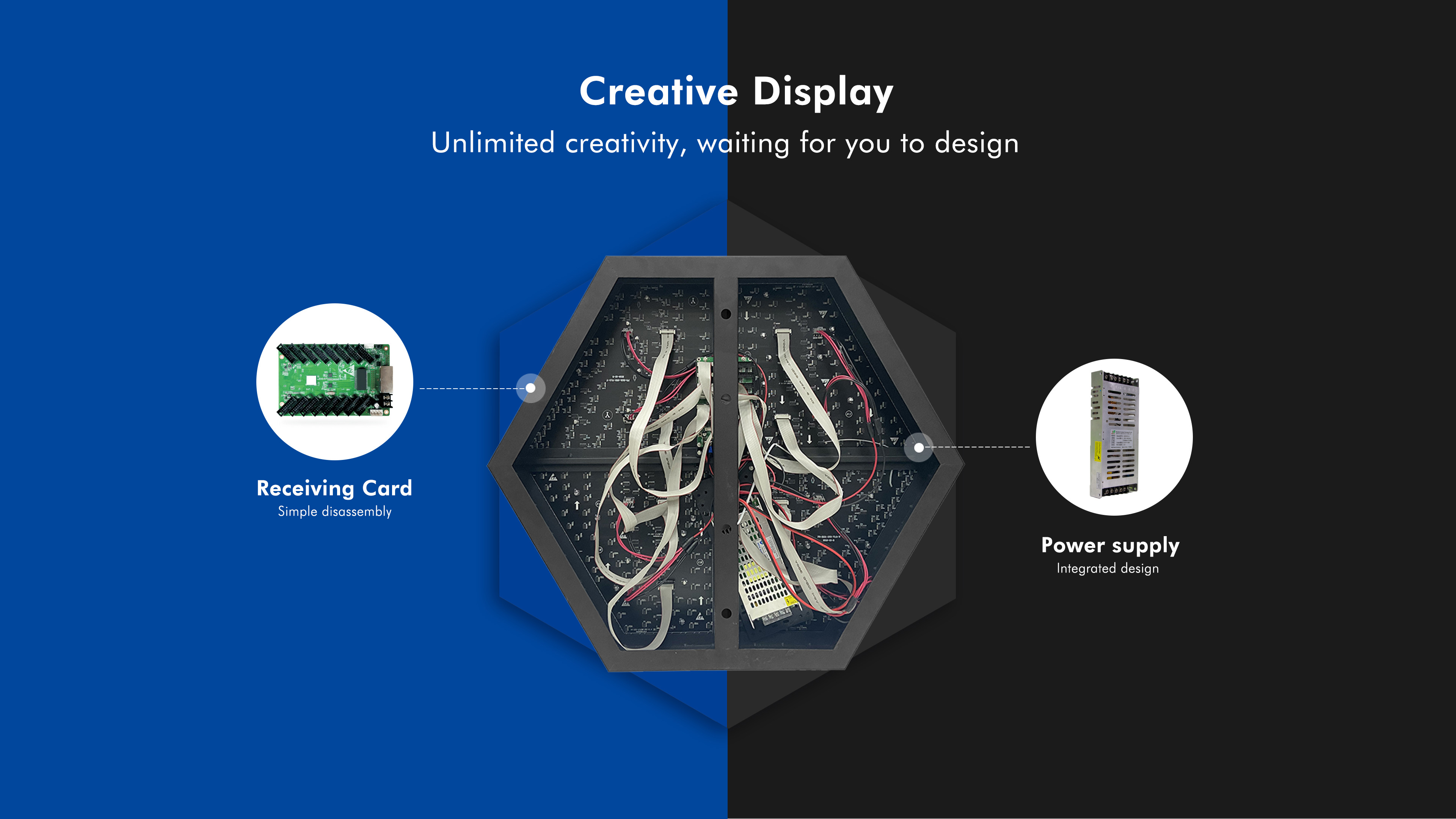 Enbon's hexagonal display is designed and combined with different triangular plate structures, which can expand the size of the hexahedron arbitrarily. This type of product is suitable for projects such as nightclubs and bars, or other special design projects. Enbon's hexahedral display can also be applied to Indoor and outdoor.